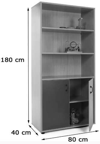Mueble compuesto por armario inferior con 2 estantes y estantería de 3 estantes en la parte superior, fabricado en melamina de haya de 19 mm de grosor, excepto trasera de 10 mm.