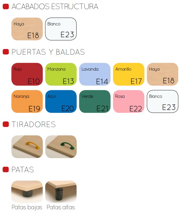Cantos de PVC de 2 mm acabados por las dos caras. Pies niveladores de PVC de 4 cm de diámetro y 4 cm de altura, para evitar la humedad y desniveles que pueda tener el suelo.